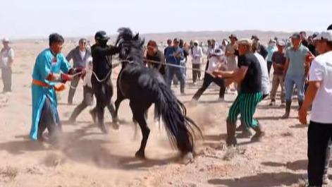 那达慕套马活动现场,黑骏马实力诠释“马力”,众人合力仍然难以制服