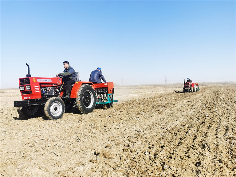 迎着正午的阳光,笔者在荣丰村小麦连片种植基地看到,一台台满载麦种的播种机、旋耕机轰轰作响在田间往来穿梭,完成土地平整、播种、掩种等流程。