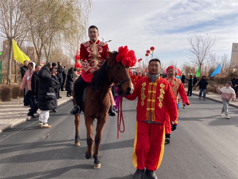主持人精彩的开场吸引人群聚集过来。秧歌队围成一个圈,一名骑着高头大马、穿着中式喜服、身披大红花的年轻男子被围在中间。在喜庆的音乐声中,主持人让大家让出一条接亲道路,新郎骑马缓缓前行,红色的八抬大轿紧随其后,秧歌队敲锣打鼓,一路欢声笑语地去接新娘,披着红盖头的新娘被抬上喜轿。主持人按照传统的中式婚礼习俗为两位新人主持了婚礼。在欢呼声中,新娘的妹妹站在小二楼上抛绣球,有幸接到绣球的男子能得到一块10斤重的年猪肉。只见楼下站满了想接绣球的男子,新娘的妹妹虚晃了几次后,将绣球抛给一名年轻帅气的小伙子。接到绣球后,小伙子捧着绣球、提着猪肉在现场走了一圈,让在场的人羡慕不已。