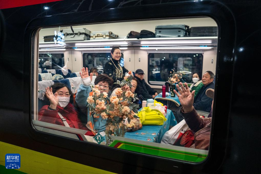 1月14日,西双版纳州民族文化工作团的演员在D87次中老铁路国际旅客列车上表演歌舞。新华社记者 胡超 摄