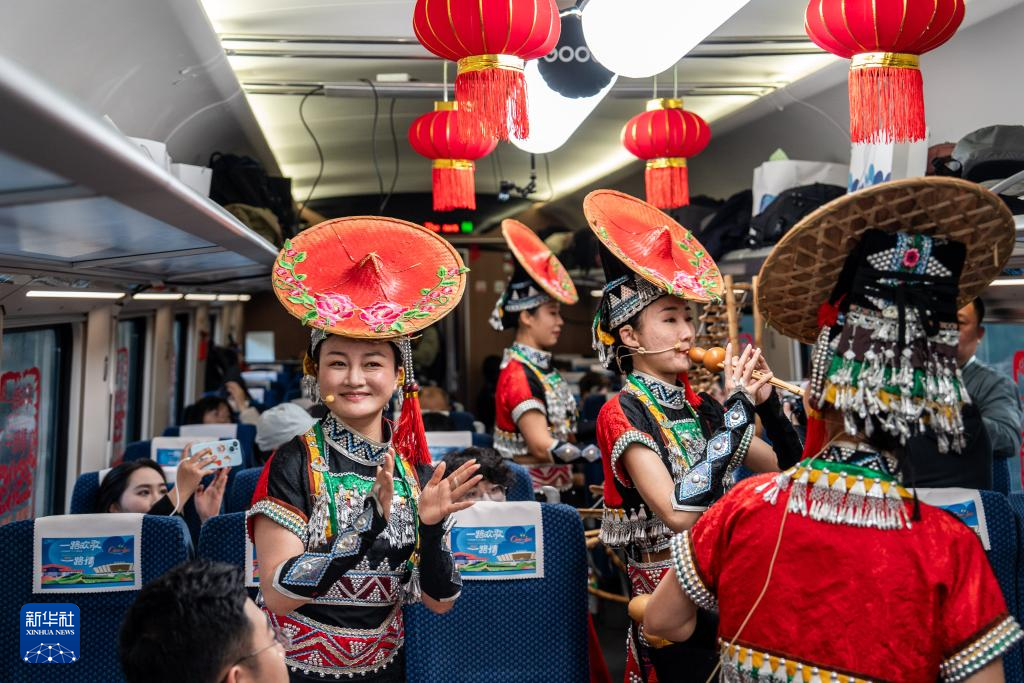 1月14日,西双版纳州民族文化工作团的演员在D87次中老铁路国际旅客列车上表演节目。新华社记者 胡超 摄