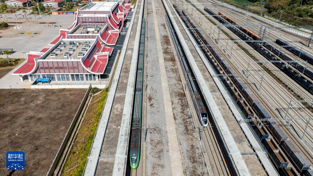 1月14日,D87次中老铁路国际旅客列车(左)和“澜沧号”动车组列车停靠在中老铁路磨憨站(无人机照片)。新华社记者 胡超 摄