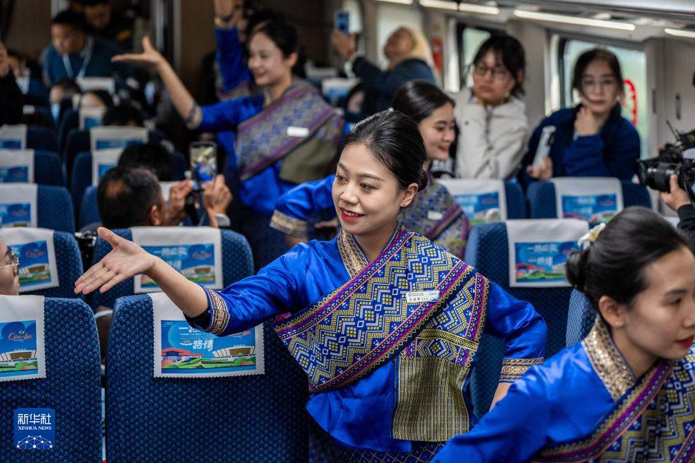 当日上午8时8分,D87次中老铁路国际旅客列车开出昆明南站,朝老挝万象驶去。与以往车次不同,一台跨国文艺演出的直播信号正随着奔驰的列车传遍各地,让各类“屏幕”前的观众一同感受这趟国际列车的欢歌。