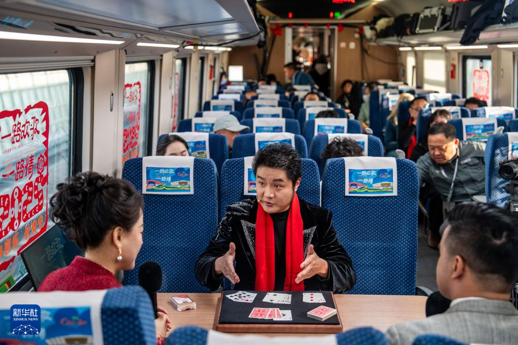 1月14日,魔术师戚原睿(中)在D87次中老铁路国际旅客列车上表演近景魔术。新华社记者 胡超 摄