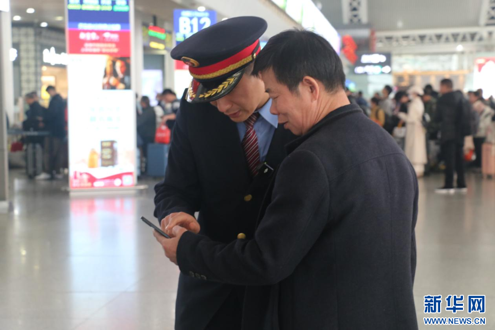 图为旅客向钱起龙咨询车次信息。新华网发(夏雨晴 摄)