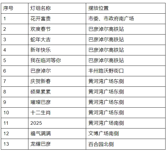 摆放在市委、市政府南广场的《花开富贵》灯组以巨型花篮为主体,各色花朵盛开四周,营造出争奇斗艳的美丽场景,为市民带来新春的美好祝愿。摆放在巴彦淖尔高铁站的《欢度春节》灯组以鼓为主体,寓意着兴盛与奋进,欢迎八方来客。摆放在黄河湾步行街的《璀璨巴彦》灯组以巴彦淖尔的特色文化为主题,展现地方魅力。摆放在百合园的《龙耀巴彦》灯组以龙盘绕在灯笼上为主体,寓意着中国文化的源远流长和繁荣昌盛,展现出浓厚的节日氛围。