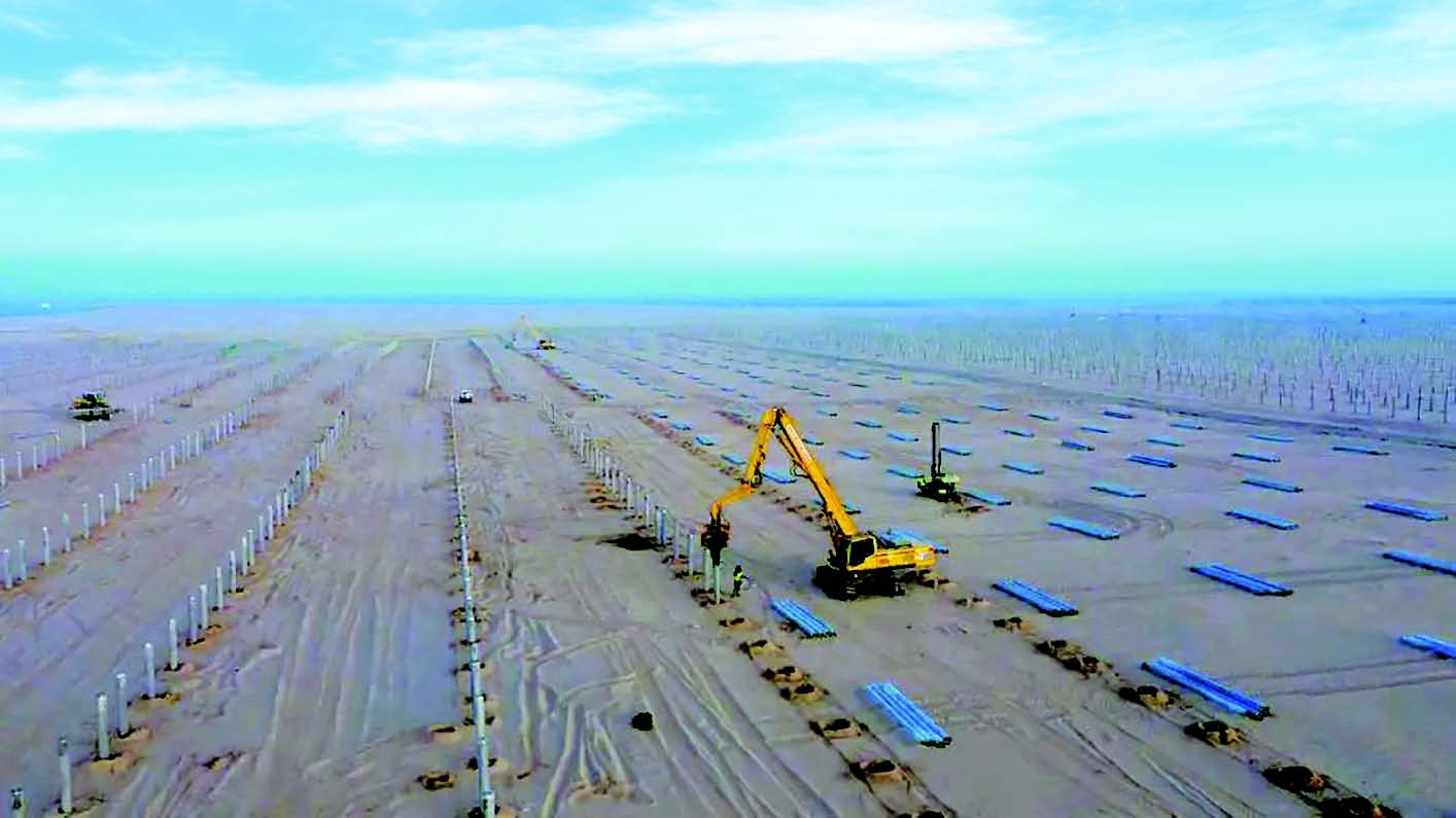 在乌兰布和沙漠东北端的沙海中,工人们在光伏发电板下用压沙叉挖沙沟、铺草格、压流沙。另一边,沙障铺设机轰鸣着将草嵌入流沙中,用一个个“田字格”给沙海“锁边”……这是去年冬天内蒙古能源集团磴口县160万千瓦光伏+生态治理项目现场的施工场景。该项目计划完成工程固沙任务4.5万亩,在施工过程中,沙障铺设机、固沙机、自行式压沙机等现代化机械替代了传统的人挑肩扛、马拉手推。“之前我们一直采用人工压草方格的方式,每人每天最多压一亩地。现在采用机械压沙方式,效率至少比人工压草翻了一倍。”现场施工人员赵建军感慨地说,“如今,治沙方式已由‘人海战术’向‘机械会战’转变,有效提升了生态治理质量和效率。”