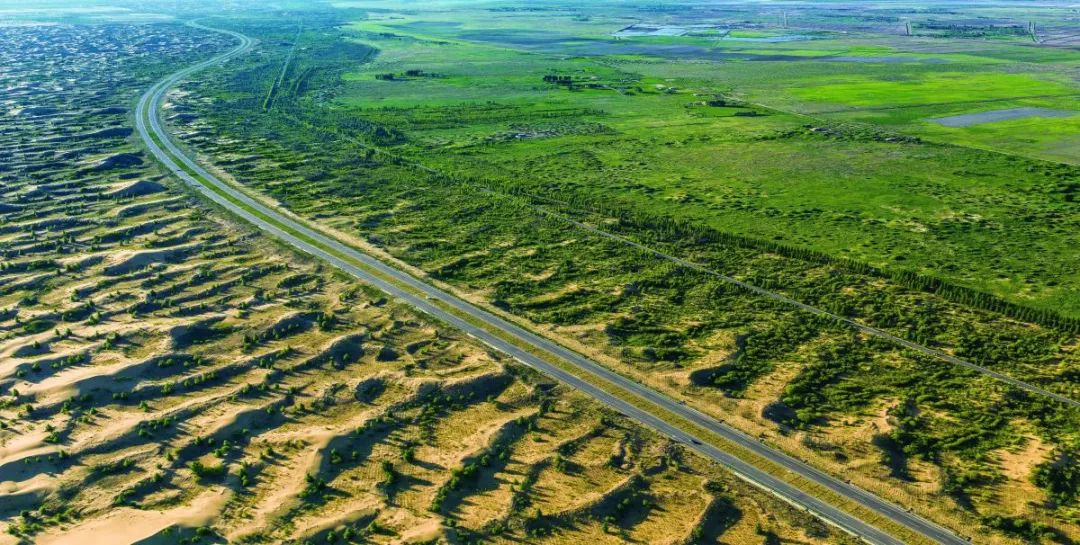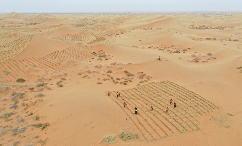在阿拉善左旗腾格里沙漠S315沿线固沙工程现场,治沙工人用稻草在沙漠中扎草方格(无人机照片)。