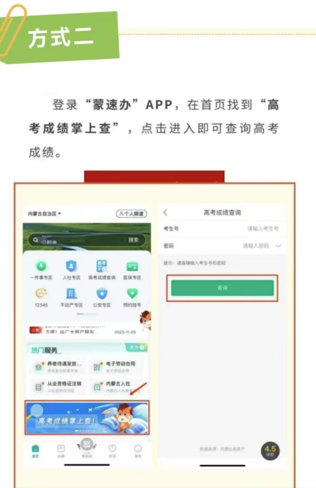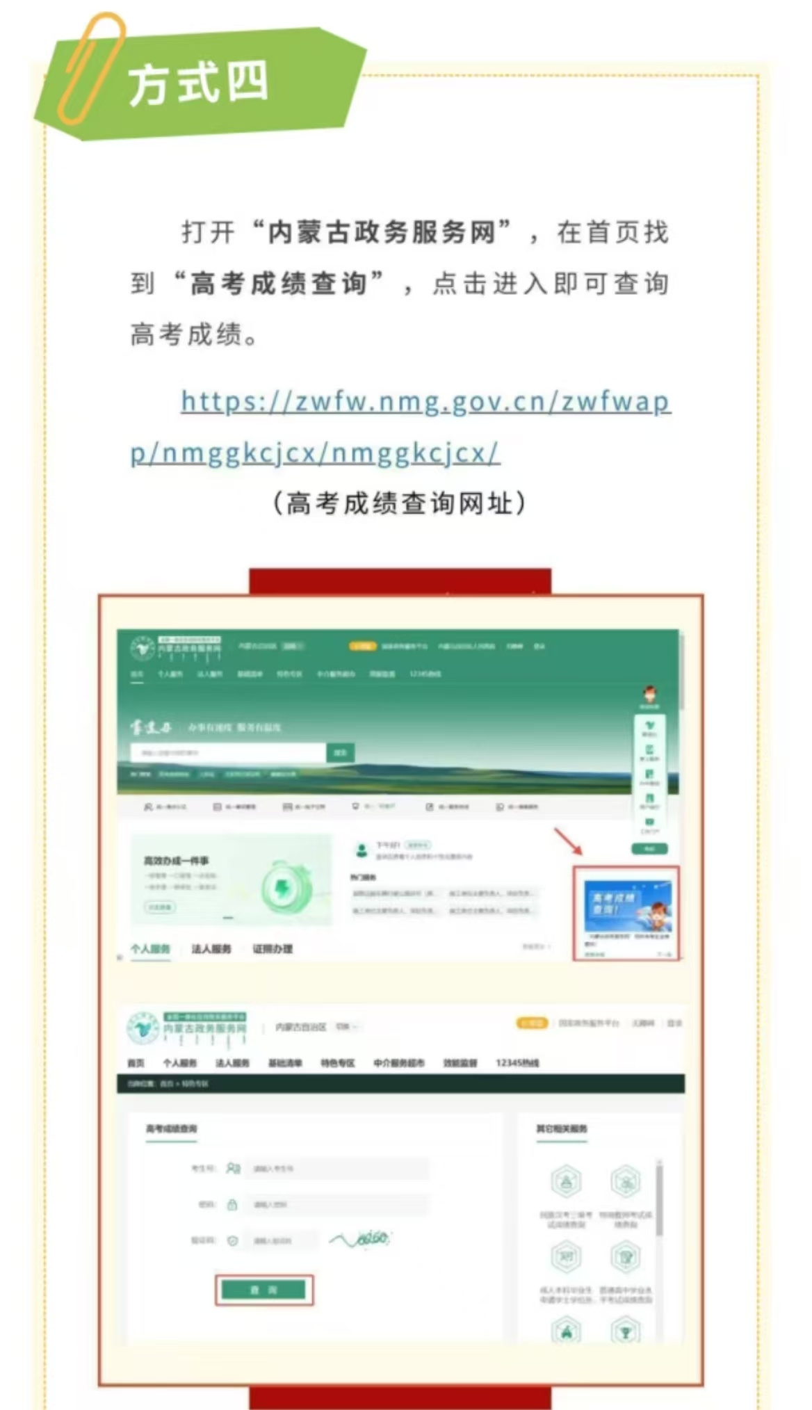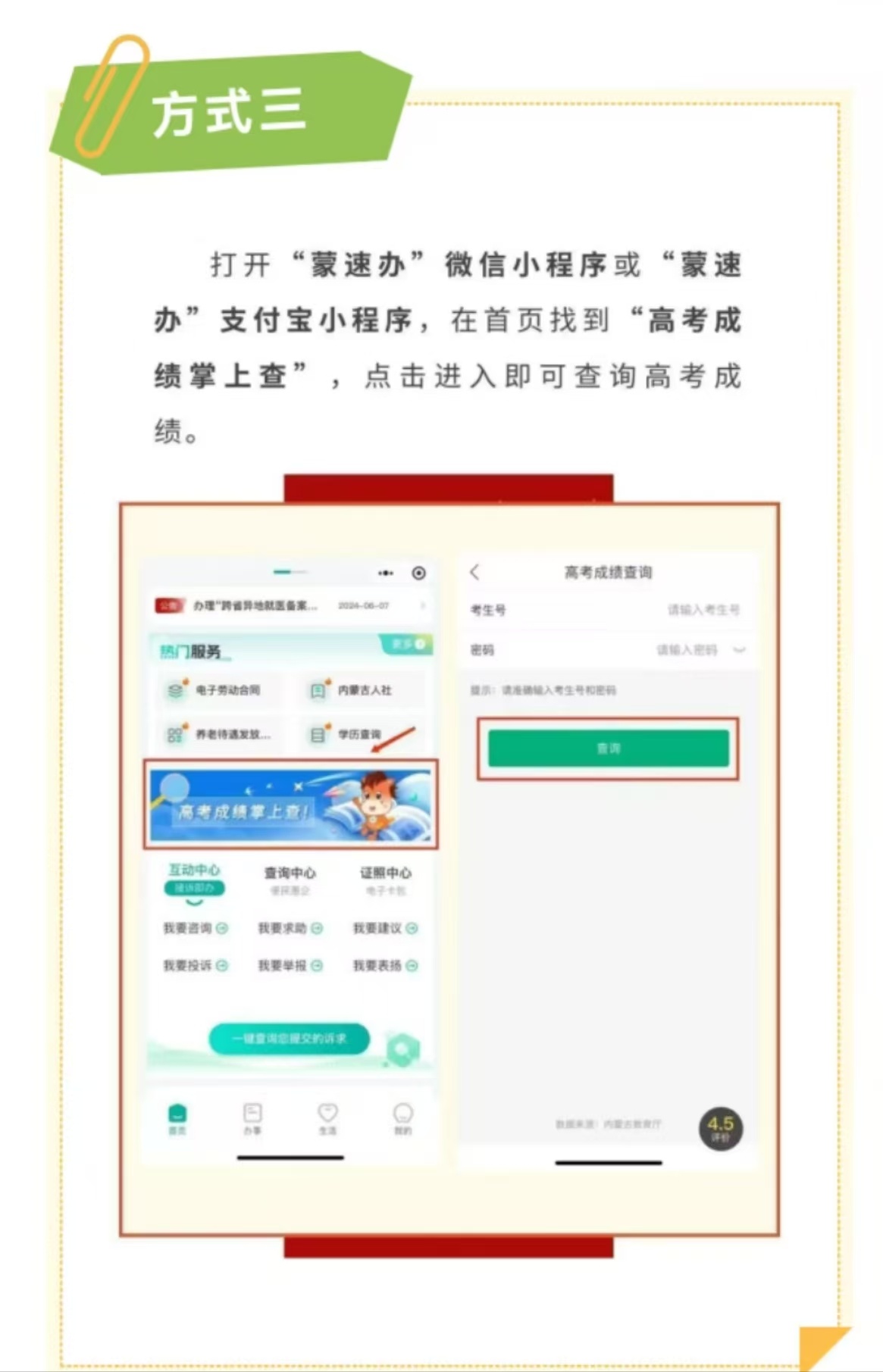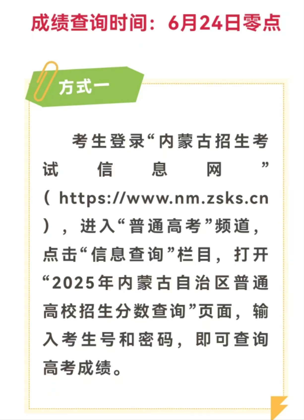 内蒙古2025年高考成绩于6月24日公布。考生可于当日零点起登录“内蒙古招生考试信息网”(https://www.nm.zsks.cn),进入“普通高考”频道的“信息查询”栏目,输入考生号及密码获取成绩。也可通过“蒙速办”APP、微信小程序、支付宝小程序以及内蒙古政务服务网的“高考成绩查询”服务快捷查分。