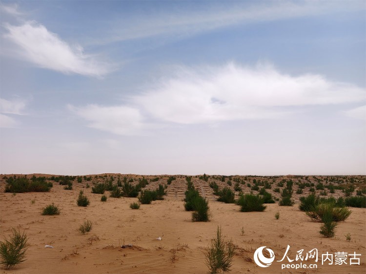 内蒙古巴丹吉林沙漠东南缘的雅布赖九棵树片区治沙现场。