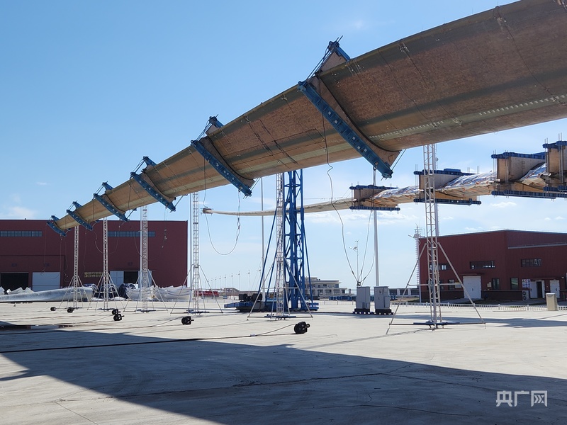 7月16日15时许,位于内蒙古包头市风电装备制造产业园内的明阳北方智慧能源(内蒙古)有限公司包头基地(以下简称“明阳包头基地”),3片长达百米的风机叶片正在风电装备检测认证中心进行测试。