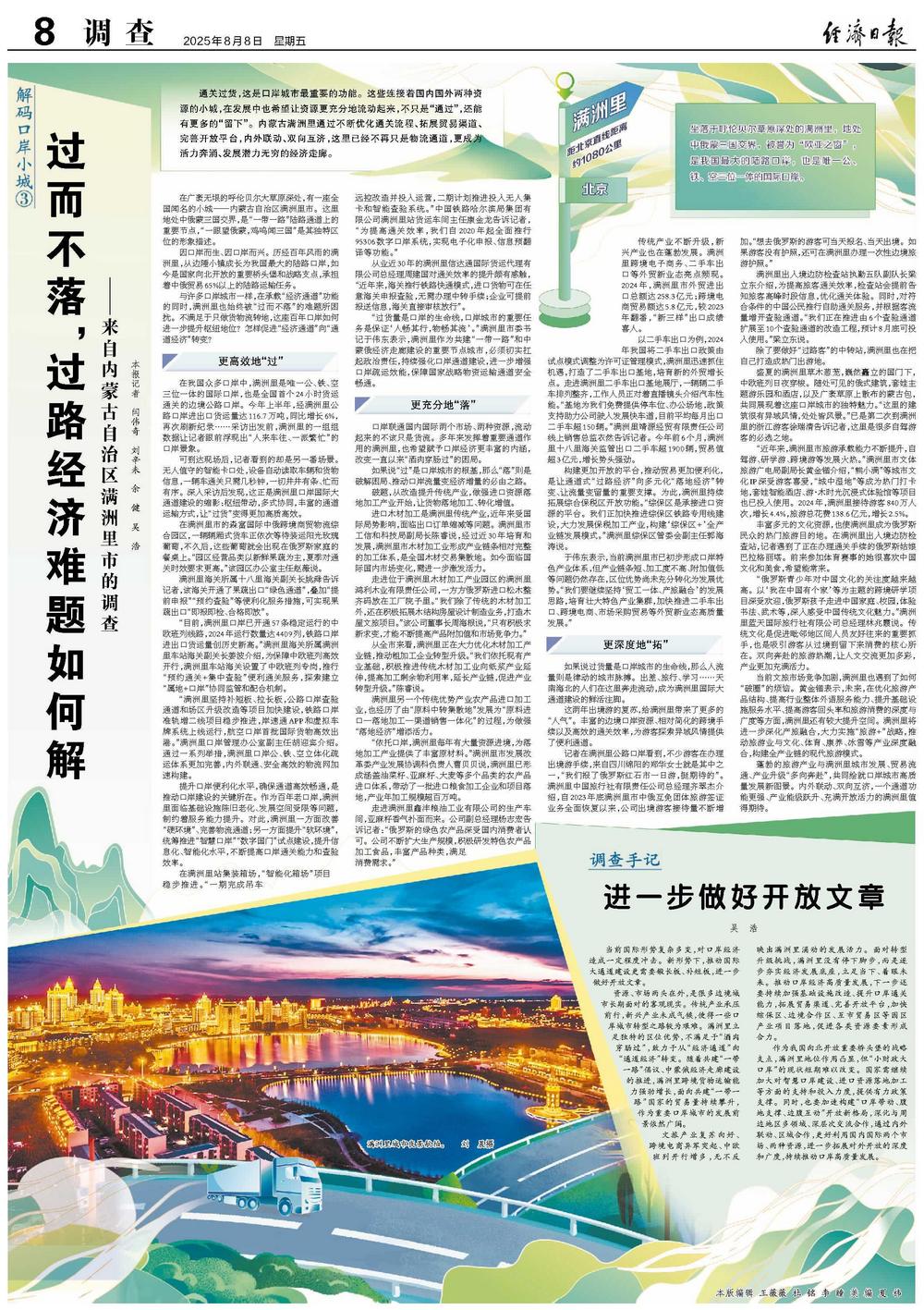 通关过货,这是口岸城市最重要的功能。这些连接着国内国外两种资源的小城,在发展中也希望让资源更充分地流动起来,不只是“通过”,还能有更多的“留下”。内蒙古满洲里通过不断优化通关流程、拓展贸易渠道、完善开放平台,内外联动、双向互济,这里已经不再只是物流通道,更成为活力奔涌、发展潜力无穷的经济走廊。