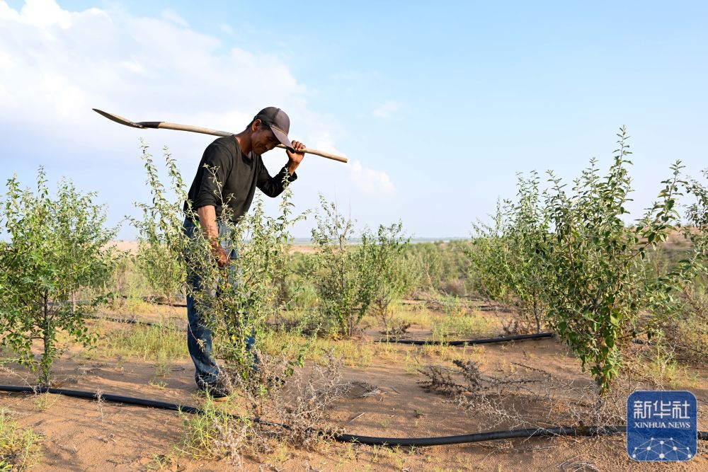 ↑工人在黄河上中游阿拉善盟乌兰布和段(阎王鼻子)阻沙入河生态修复工程项目区查看林木生长情况(8月1日摄)。