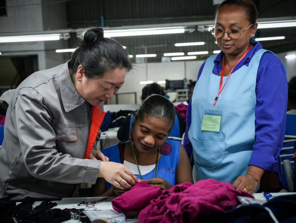 在内蒙古鹿王羊绒有限公司马达加斯加工厂,一名中方人员为当地工人进行技术指导。(李亚辉 摄)