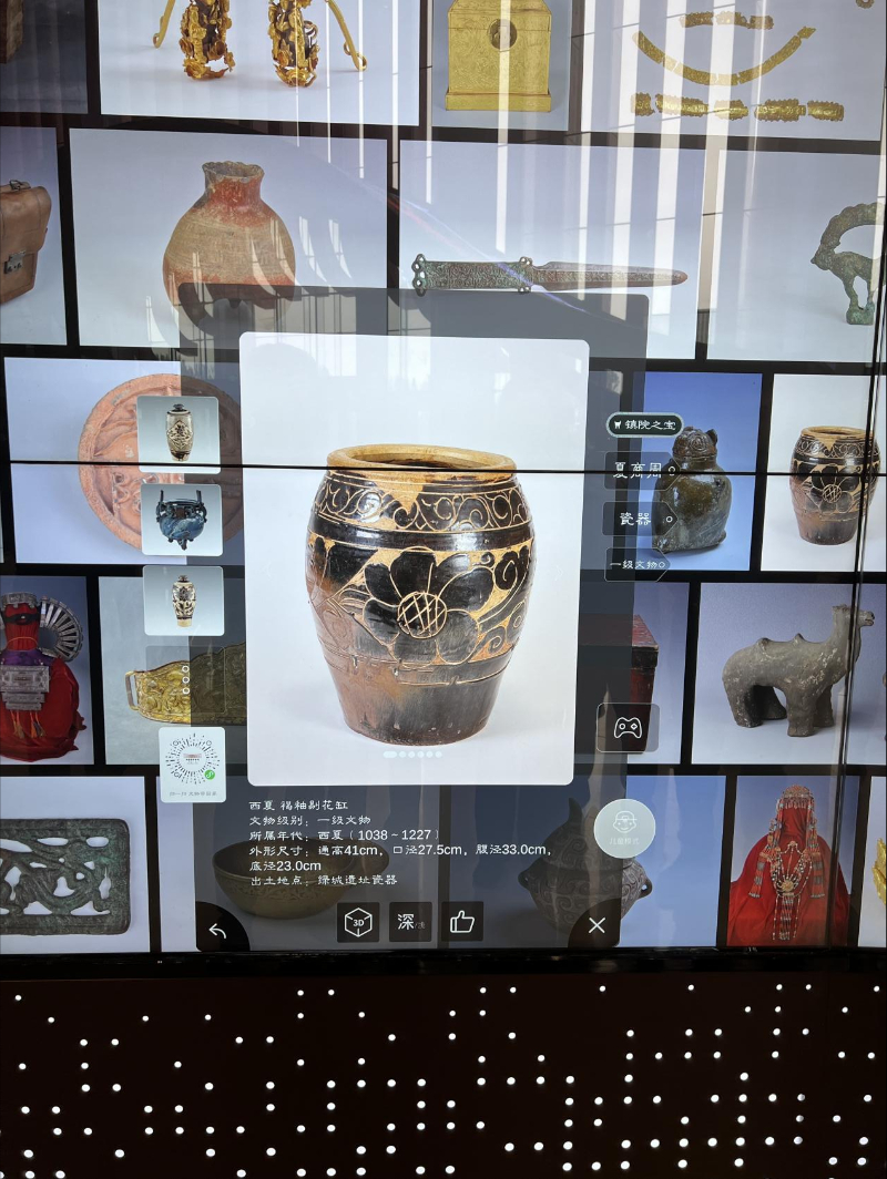 与内蒙古博物院中“文物知识图谱”墙遥相呼应的,是另一侧的“数字文物互动”墙。不同于前者侧重于文物信息的静态展示,这面墙特别注重与青少年群体的互动体验。例如,只需轻触“儿童模式”,文物展示的高度便会自动调整,更加贴近青少年的视线;再如,点击“游戏面板”,即可进入趣味互动小游戏环节,这种设计充分考虑了青少年学习知识的特点,让教育在轻松愉快的氛围中悄然进行。