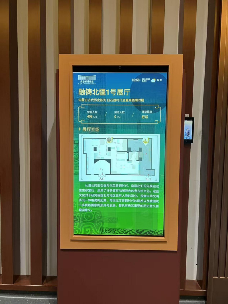 在智慧服务方面,内蒙古博物院不断提升公共体验的便捷度和舒适度。进入场馆后,每个展厅门口都有竖屏,显示场馆实时观众量。当展厅人员达到承载量80%时,屏幕上会显示,建议大家去其他展厅参观。若想看某个文物,可以直接点击屏幕上的路径。