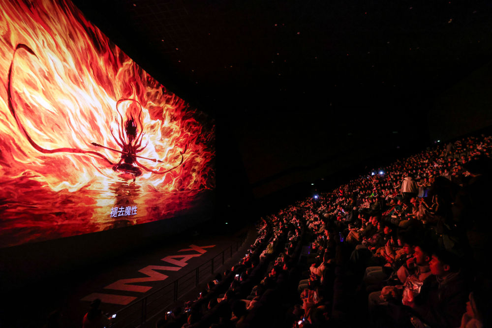 2025年2月25日,观众在贵阳越界影城IMAX影厅内观看电影《哪吒之魔童闹海》。动画电影《哪吒之魔童闹海》自1月29日上映后票房一路高歌猛进,仅用8天便登顶中国影史票房榜,随后成为全球单一市场票房冠军、全球动画电影票房冠军。2025年以来,国家电影局等相继启动“跟着电影品美食”“跟着电影去旅游”“中国电影消费年”活动,充分发挥电影对提振消费的积极作用;各地文旅部门等通过发布观影消费券、举办主题活动等形式推动影旅融合,发展票根经济。