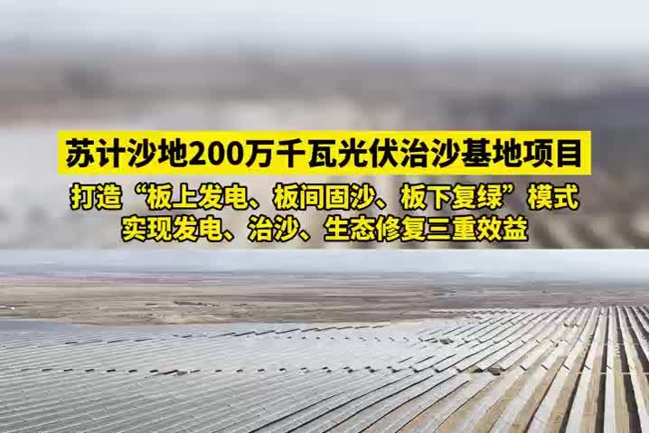 苏计沙地200万千瓦光伏治沙基地项目,打造“板上发电、板间固沙、板下复绿”模式,实现发电、治沙、生态修复三重效益