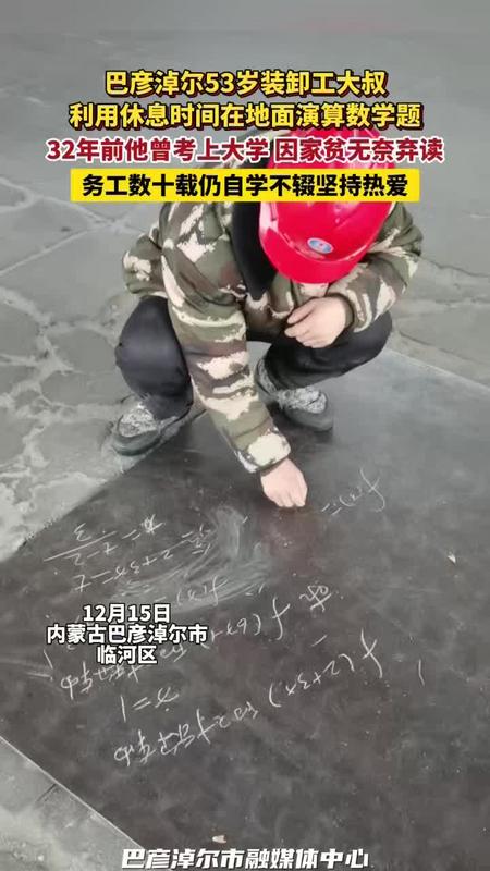 巴彦淖尔53岁装卸工大叔利用休息时间在地面演算数学题,32年前他曾考上大学,因家贫无奈弃读,务工数十载仍自学不辍坚持热爱