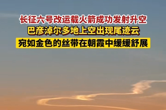 长征六号改运载火箭成功发射升空,巴彦淖尔多地上空出现尾迹云,宛如金色的丝带在朝霞中缓缓舒展