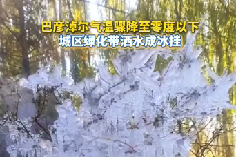 巴彦淖尔气温骤降至零度以下,城区绿化带洒水成冰挂