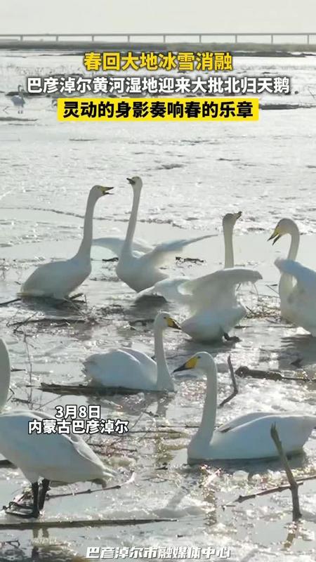 春回大地冰雪消融,巴彦淖尔黄河湿地迎来大批北归天鹅,灵动的身影奏响春的乐章