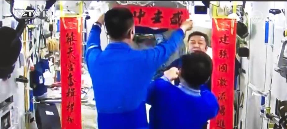 今年春节,记者一来到中国航天员中心,就看到神舟十五号航天员乘组为除夕夜做准备,今年空间站上的春联是由三人共同创作而成。“盛世中华”,由01航天员费俊龙书写,“筑天宫奋楫扬帆”由02航天员邓清明书写,“建强国激流勇进”由03航天员张陆书写。随后,他们将春联挂上空间站,营造出浓浓的节日氛围。
