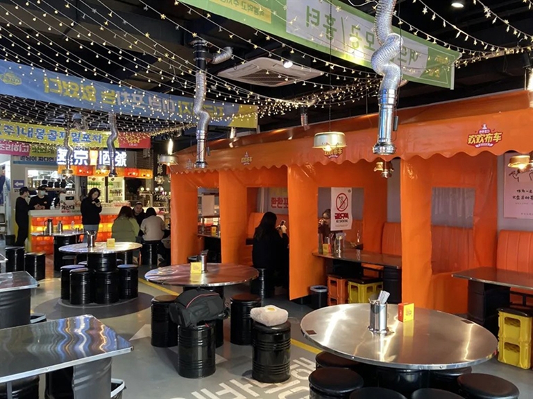“欢欢布车”,光听名字就充满了乐趣,进店右排桔黄色装饰布搭成的一个个隔间,像极了韩国街头帐篷车路边摊。这是一家具有延边风味的美食店,颇受年轻人欢迎。