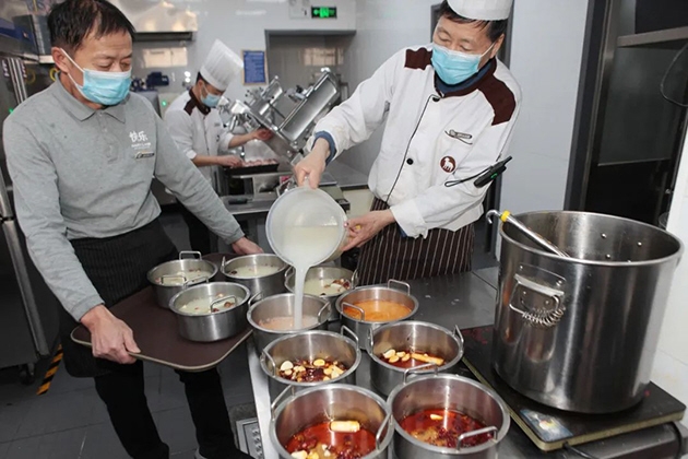 记者带着对“快乐小羊”素颜秘籍的好奇走进了后厨。配锅师傅王玉山正在为提前兑好的锅底浇汤,浓郁的奶白色汤汁倒入火锅中,立刻散发出浓浓的骨香。“从初二开始到今天,就餐的人特别多,平均每天要用完18~20桶骨汤。每天早上不到6点我就来熬汤了,先让牛大骨汆水20分钟,接下来放盘里烤70分钟;同时老母鸡也要过水和炒制,经过文火慢炖6小时,沉淀出浓香大骨汤,让锅底有‘骨气’。再经选、泡、炒、熬、焖、煮6道工序,加入36种草本精华,辅料坐镇让火锅有‘灵魂’。”说起汤料,王玉山满满的热爱和专业。