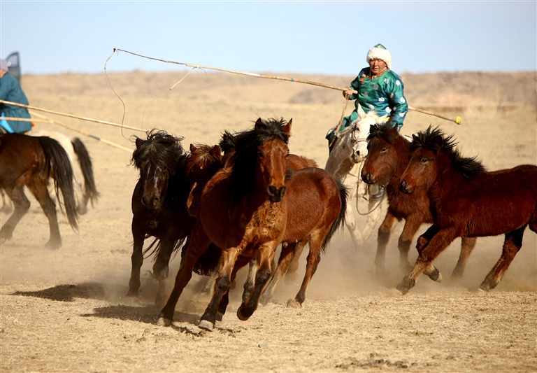 近日,乌拉特中旗的牧民陆续开展打马印、驱虫等牧业生产活动。图为牧民进行套马。