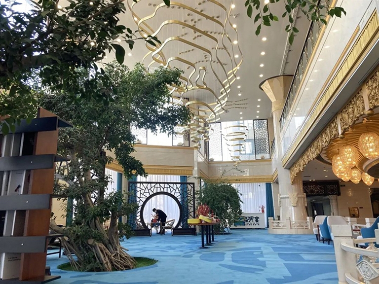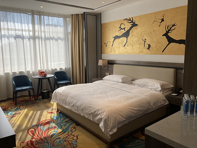 穿过恢弘大气的前厅,沿玻璃廊道前行,郁郁葱葱的园林景致尽收眼底。“这里向左是餐饮楼,向右是客房区,共有3栋客房楼,内设200多间客房,7种房型满足不同的宾客需求,房间内还可饱览园林景致……”在工作人员的介绍下,记者乘电梯来到钟鼎楼二楼,“镜湖厅”“莫尼山”“鸡鹿塞”等12间装潢考究的雅间以巴彦淖尔的风景名胜为名,让人倍感亲切。