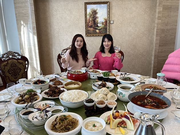 “京师美馔,莫妙于鸭。这第二道菜是我们本季的主打菜,也是最受客人喜爱的一道菜——北京烤鸭。”黄主厨介绍,为了让客人在巴彦淖尔吃到正宗的北京烤鸭,饭店特骋北京名牌酒店烤鸭大师,烤鸭由果木烤制而成,酥而不腻。长方形的木底瓷盘搭配色泽红亮的鸭肉,鸭皮细腻,肉质柔韧,保留老北京烤鸭的香醇。用小饼卷着小葱、酱汁和黄瓜,一口下去,满满的幸福感。