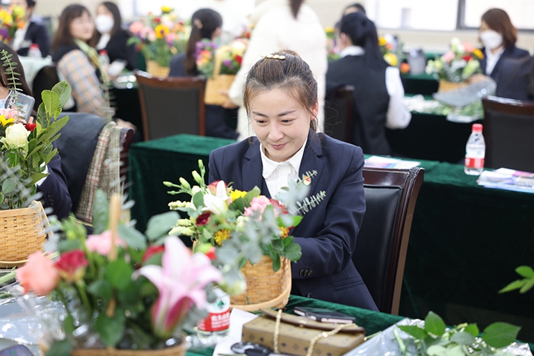3月7日,河套农商银行与临河区西环街道花城社区开展党建结对共建“三月与你·皆是最美风景”“三八”妇女节创意插花活动。图为河套农商银行女职工学插花。