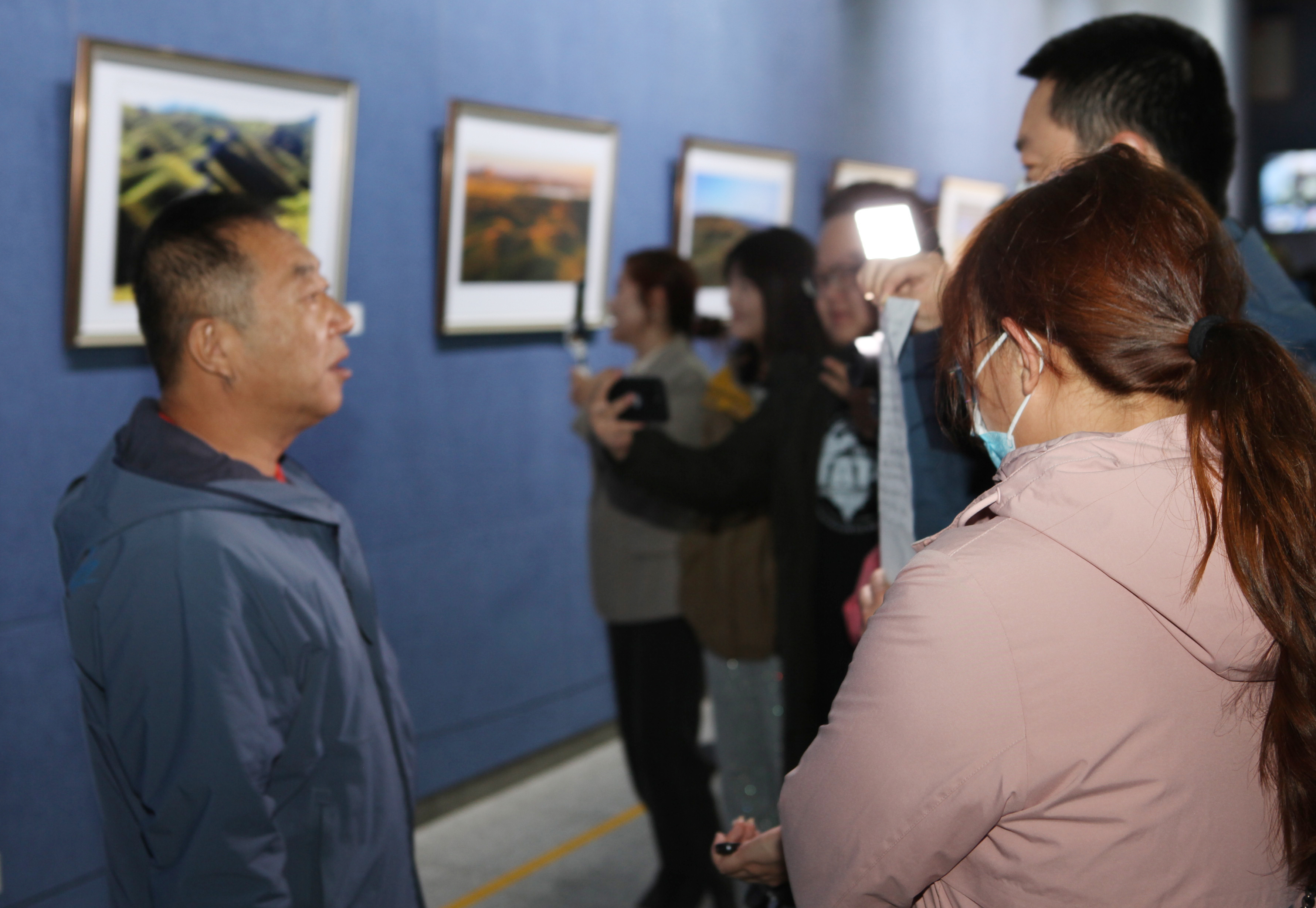 漫步展厅,市摄影家协会副主席李鹏认真观看每一幅摄影作品,时不时与大家交流。