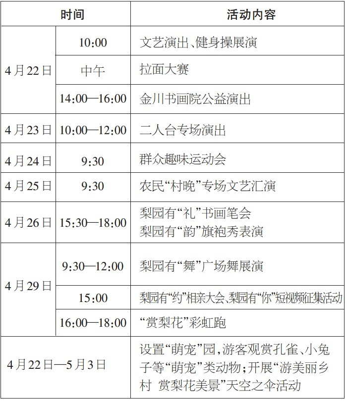 活动时间是4月22日—5月3日。活动期间将举行文艺演出、健身操展演、拉面大赛、歌舞、朗诵、二人台专场演出、群众趣味运动会、农民“村晚”专场文艺汇演、书法、绘画、旗袍秀、广场舞展演、相亲大会、短视频征集、地方美食小吃体验、“赏梨花”彩虹跑等活动。