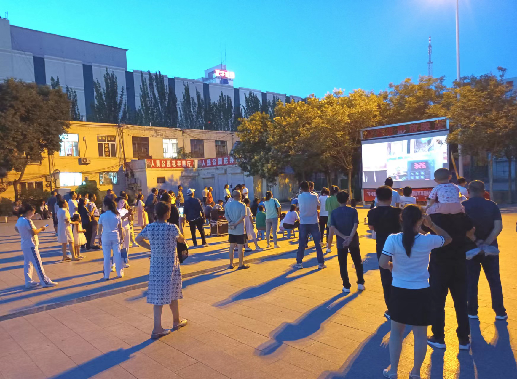 7月24日傍晚,在临河人民公园广场上,不少居民围坐在露天银幕周围,津津有味地观看正在放映的军事电影《中国蓝盔》。