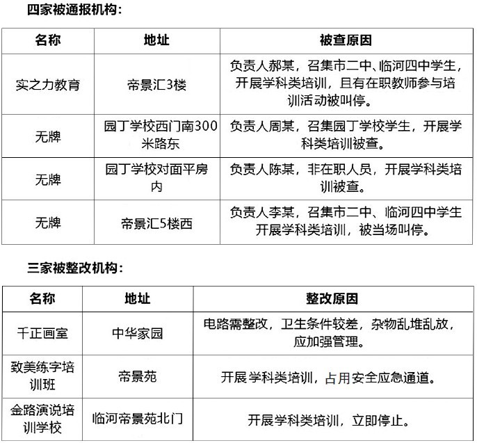 根据《意见》,联合检查组对发现的违法违规培训行为进行查处、严厉打击并予以曝光,执法人员当场下发停止或整改办学通知书,要求培训机构安全疏散学生,责令其立即停止办学,并退还所收费用,并对负责人进行诫勉谈话,向其宣传国家“双减”政策,涉事的在职教师由临河区教育局监审部门作出处罚。