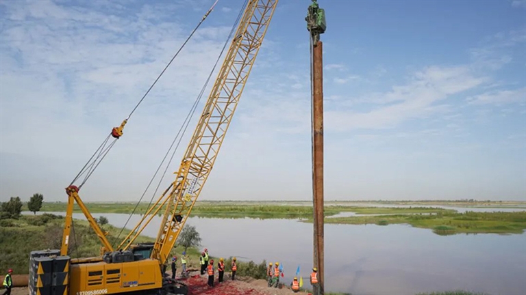 近日,由中交第二公路工程局有限公司承建的国道110线磴口黄河大桥工程开始钢栈桥搭设施工。