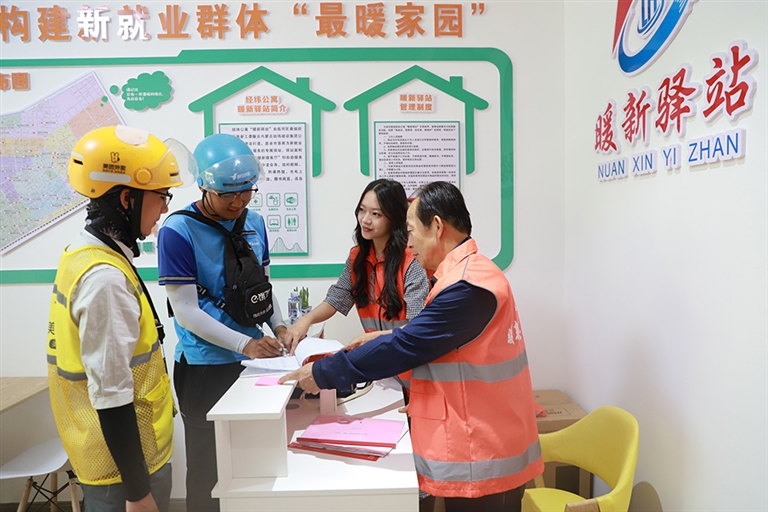 新就业群体人员在“暖新驿站”不仅找到了组织,也获得了更多成长。他们投身城市管理、平安建设等志愿服务,发挥“民情前哨”作用,担任移动网格员、城市宣传员、市民服务员,积极融入城市建设、融入基层治理、融入民生服务,增强了社会责任感、群体获得感和个人荣誉感,对这个城市有了主人翁意识、有了家的归属感。
