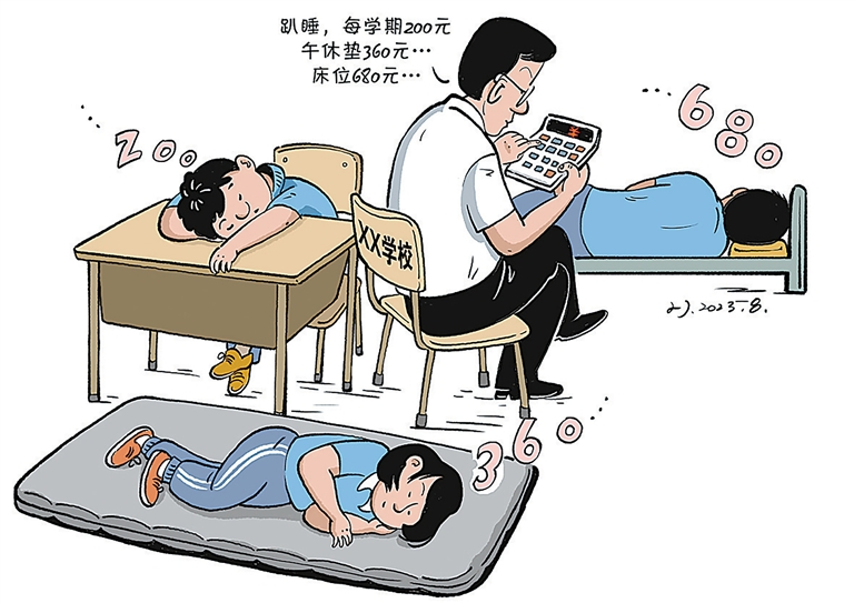 学生午睡也要收费?近日,网传广东东莞某学校学生午睡可选择不同价位,每学期趴在桌子上交200元、在教室用午休垫360元、去午休室睡床680元。面对质疑,学校称收费标准是教育局规定的,且采取自愿原则,并非强制。不是设法为孩子午休提供方便,而是按孩子“睡姿”收费,乃至趴在桌子上睡也要收费,显然是“睡”过头了。
