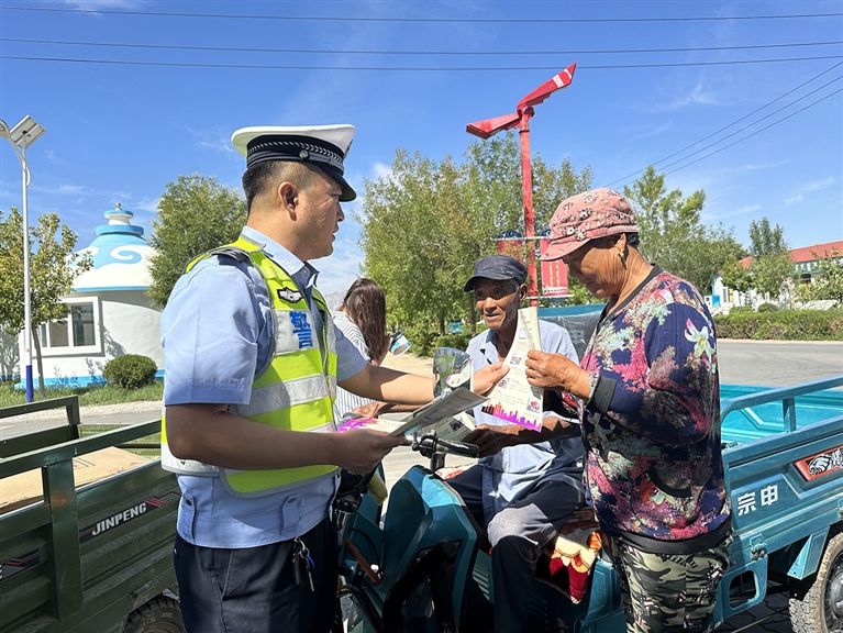 近日,乌拉特后旗交管大队组织宣传民警走进塞上新村开展了非机动车交通安全专项宣传活动。(通讯员 布和 摄)