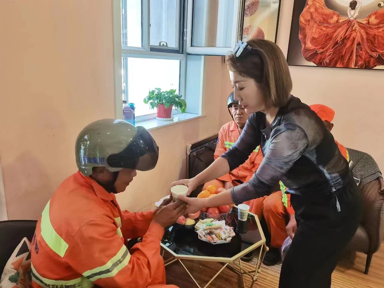 近日,临河美丽园北门纤美意美容生活馆店主为100名环卫工人免费送上布鞋,还为在店里休息的环卫工人送上水果、矿泉水等。这是巴彦淖尔市向日葵志愿者协会在临河设立的第5个爱心驿站。