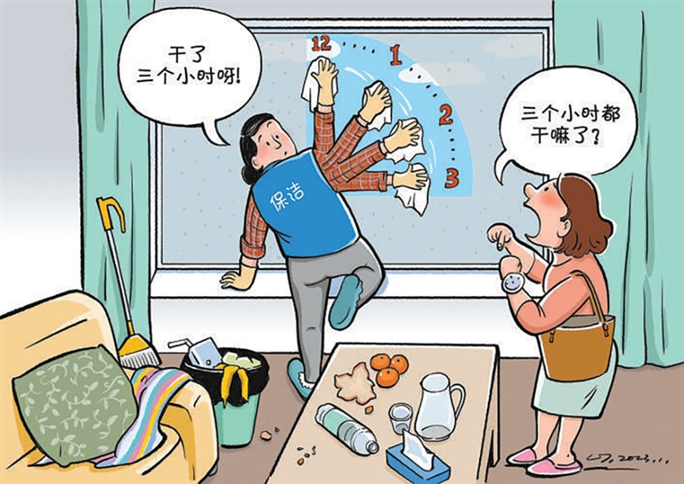近日,成都一网友发视频吐槽,在网上买了某家政公司深度保洁服务,3小时后发现,只擦过玻璃,连垃圾都没倒。工作人员回复:“消费者购买的是3个小时的时长,而不是说要把全屋打扫完。”消费者花钱请保洁,目的是清洁房屋,而非消磨时间。工作效率才是衡量服务合格的标准。