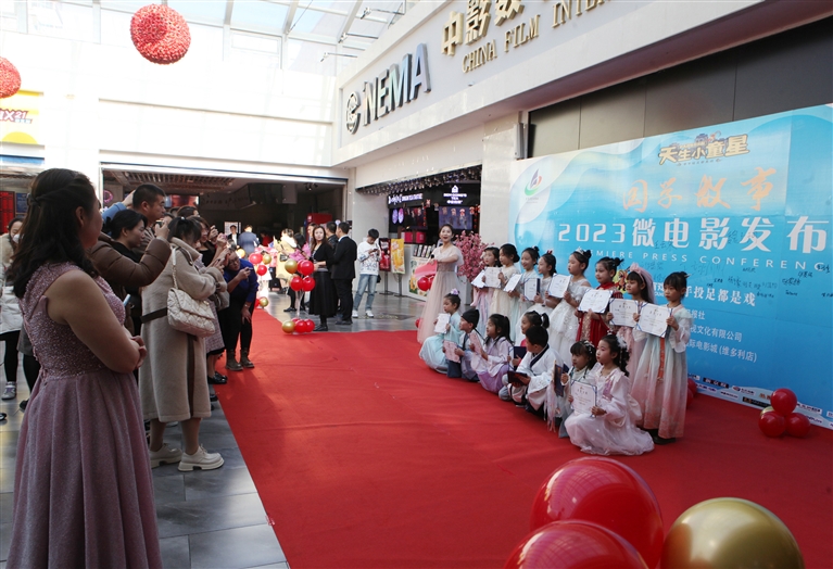 11月19日,国学故事2023微电影发布会在中影数字国际电影城(维多利店)举行,40多名小演员走红毯、在签名墙上签名、与家人合影留念。