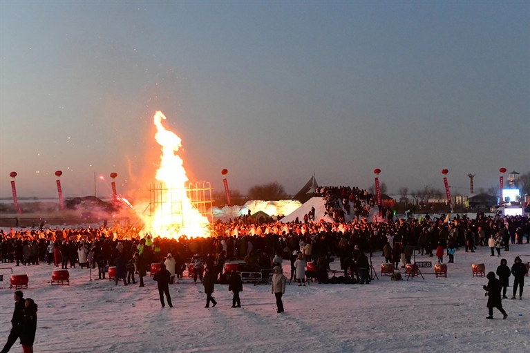 夜色渐浓,在人们的期盼中,大型篝火被瞬间点燃,在冲天的火光映照下,人们载歌载舞,一片欢歌笑语。