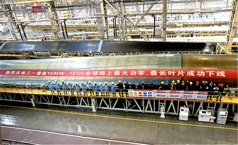 1月21日,三一重能131米陆上风电叶片在巴彦淖尔零碳数智产业园成功下线,刷新全球最长陆上风电叶片纪录。