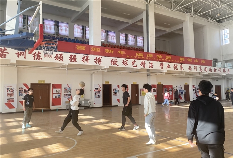 图为市民在临河金川学校体育馆里打篮球。