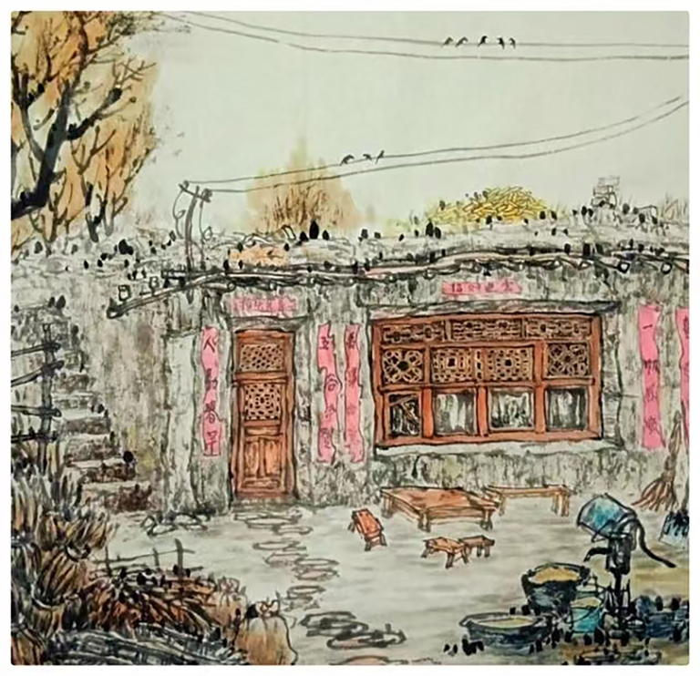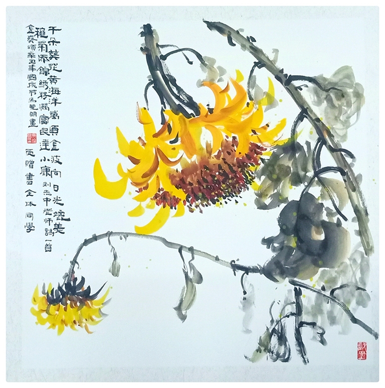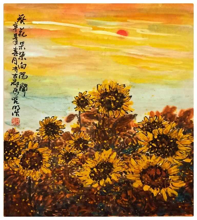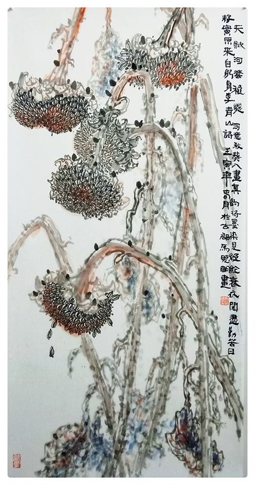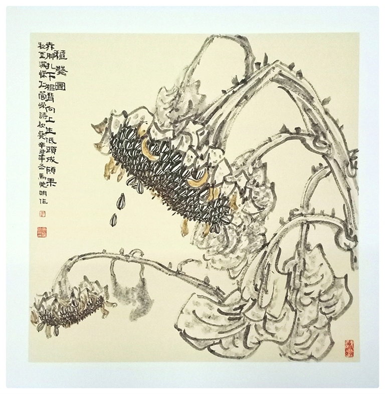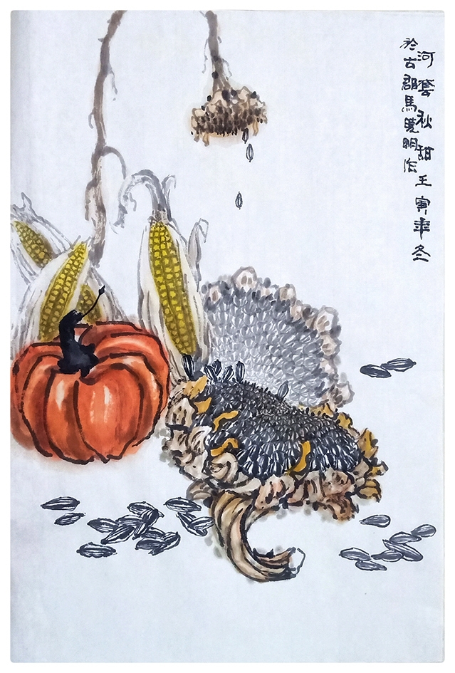 马晓明的河套秋葵系列作品,墨韵厚重内敛,笔墨朴拙劲健、沉着古雅又生气远出。透过他的秋葵,仿佛嗅到了阳光和泥土的味道,他以画家独特的审美眼光和表现手法,描绘出了沉甸甸的、硕果累累的河套秋收景象。