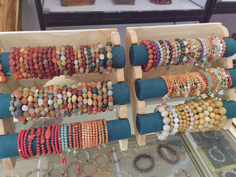 “这个玉石吊坠是用当地的黄蜡石做原材料,经过裁切、精雕、抛光……做成沙嘎的形状,这是我们自创的工艺品。”乌拉特后旗玛瑙湖石博城民委展厅内,店主布德在为顾客介绍玉石沙嘎饰品。