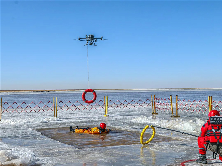 演练模拟黄河巴彦淖尔段因上下游温度差异,形成冰坝,上游水位急剧上升,造成堤防溃口,水流漫溢到附近村庄,导致大量群众被困,部分人员落水。内蒙古消防救援总队指挥中心接到自治区防汛抗旱指挥部预警后,调集巴彦淖尔支队级冰冻雨雪灾害救援专业队、站级分队,水利、公安、交管、医疗、蓝天救援队等社会联勤联动单位共计21车116人,携带卫星便携站、4G单兵、无人机等通讯设备以及防护、破拆、救援、排涝等四大类1000余件(套)装备器材赶赴灾害事故河段开展救援。演练设置冰面切割与移除、无人机定点抛投救援、救生抛投器救援等11个演练科目,采用冰面探测、绳索倍力系统保护等新技战术战法,配合救生抛投器、大型载物无人机开展处置。高质量的演练,切实提升了消防救援队伍凌汛灾害事故应急处置水平。